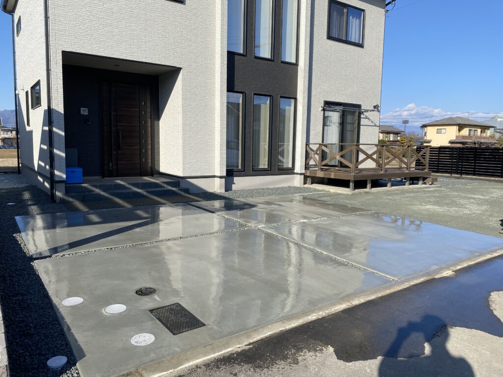 この度は庭松を選んでいただき、誠にありがとうございました!新築工事が始まる前からお打ち合わせをスタートさせていただき、十分な打ち合わせ期間をいただきました。最後までご納得いただくけるまで何度も打ち合わせを重ね、思い通りの素敵な外構となりました!隣接している境界の外側は高さ1600㎜もの高低差があり、お子様を遊ばせるにはちょっと心配な土地でしたが、フェンスを設置したことにより安心してお庭でお子様を遊ばせられますね!樹脂製のウッドデッキは、色にこだわりを持ち最後の最後まで悩まれていましたが、お選びいただいた一番濃いこの色は、建物にとてもマッチしていると思います!ナイス選択ですね!デッキにはポイントライトを埋め込み、夜には明かりがほんのりデッキを明るくしてくれます!これも、ご主人のこだわりでした!駐車場工事は、1年間で一番冷え込んだ時期にコンクリートを打設しました。親方が養生に気を配っていただき、凍結することなく、とてもきれいに仕上がりました!工事期間中は、大変ご不便をおかけしましたが、これからは、快適な生活をお過ごしください。暖かくなりましたら、樹脂デッキの上でご家族でお茶を飲みながら楽しい日常をお送りください。